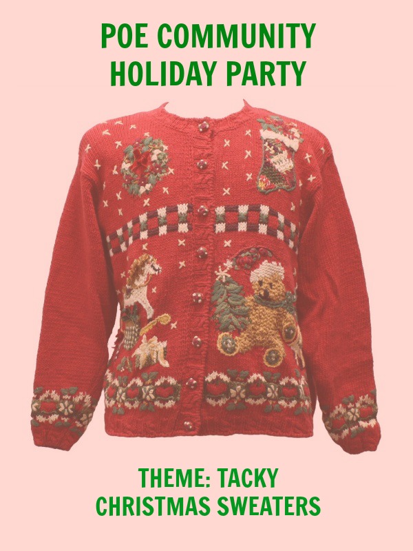 There will be food, fun, and PoE friends adorned in ugly sweaters! If you can and would like to bring something for the potluck, feel free. If not, just join the fun and wear the tackiest holiday sweater you can find!