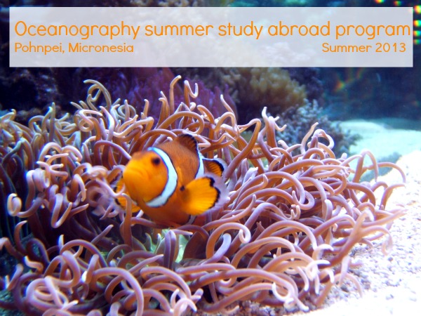 The Oceanography summer study abroad program in Pohnpei, Micronesia will take place June 22-July 20, 2013. The class will focus on coastal ecosystems in a changing climate, and will provide students with field experience studying coral reefs, mangrove forests, estuaries, and atolls, and the ways that human activities affect those ecosystems.