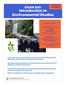 ENVIR 100: Introduction to Environmental Studies – Great course for exploring environmental majors. Learn about environmental issues in a local and global context.