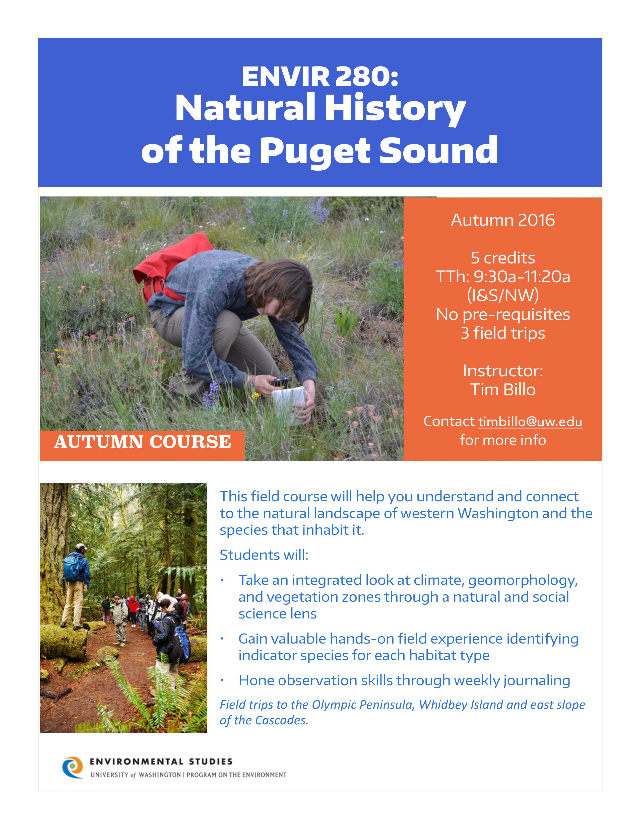 ENVIR 280: Natural History of the Puget Sound – Explore and understand the landscape of Western Washington and the species that inhabit it. Field trips to the Olympic Peninsula, Whidbey Island and east slopes of the Cascades.
