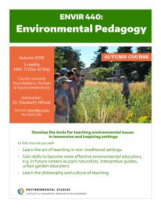 ENVIR 440: Environmental Pedagogy – Develop the tools for teaching environmental topics while learning the culture of teaching in immersive settings.