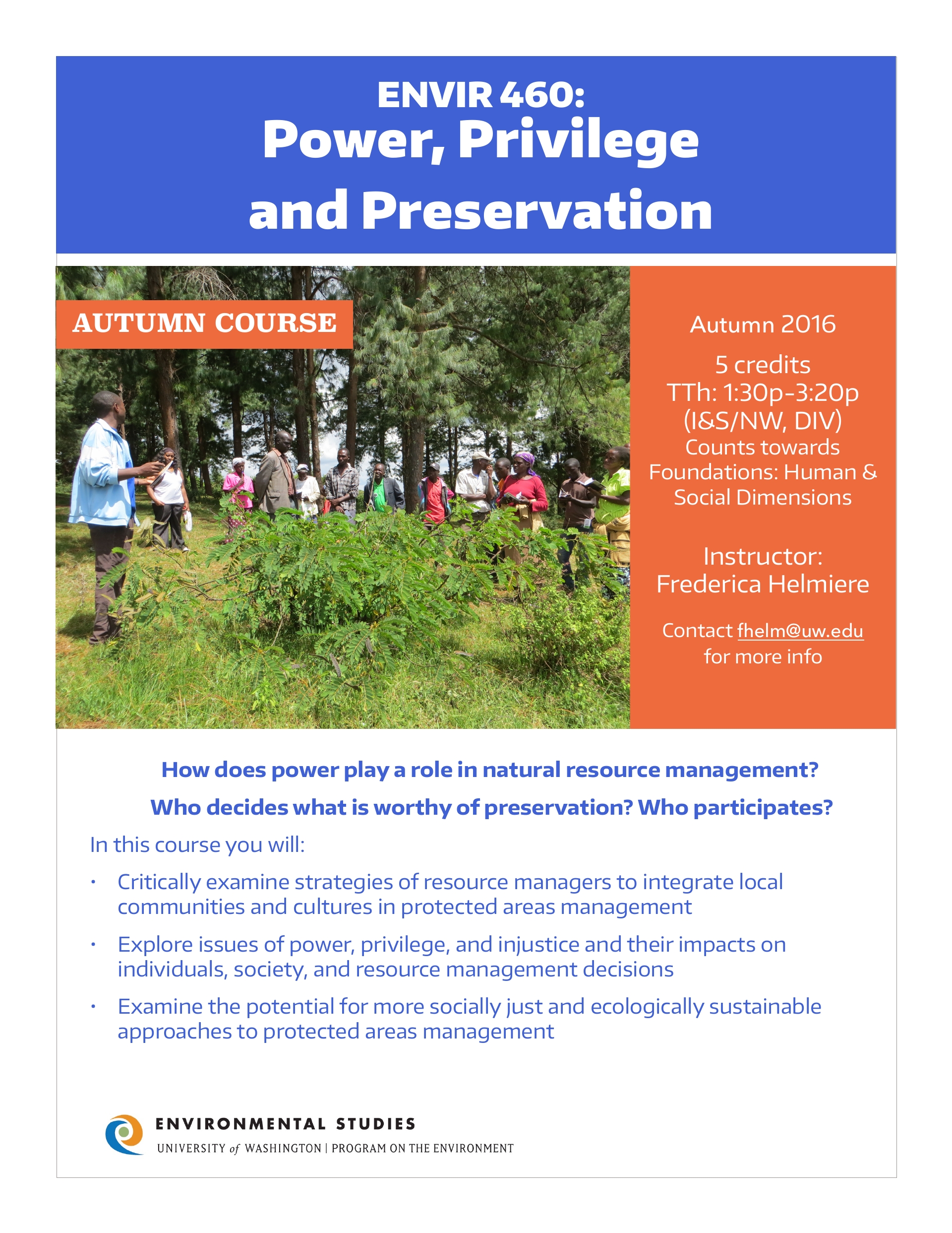 ENVIR 460: Power, Privilege and Preservation  Examine the potential for more socially just and ecologically sustainable approaches to protected areas management.