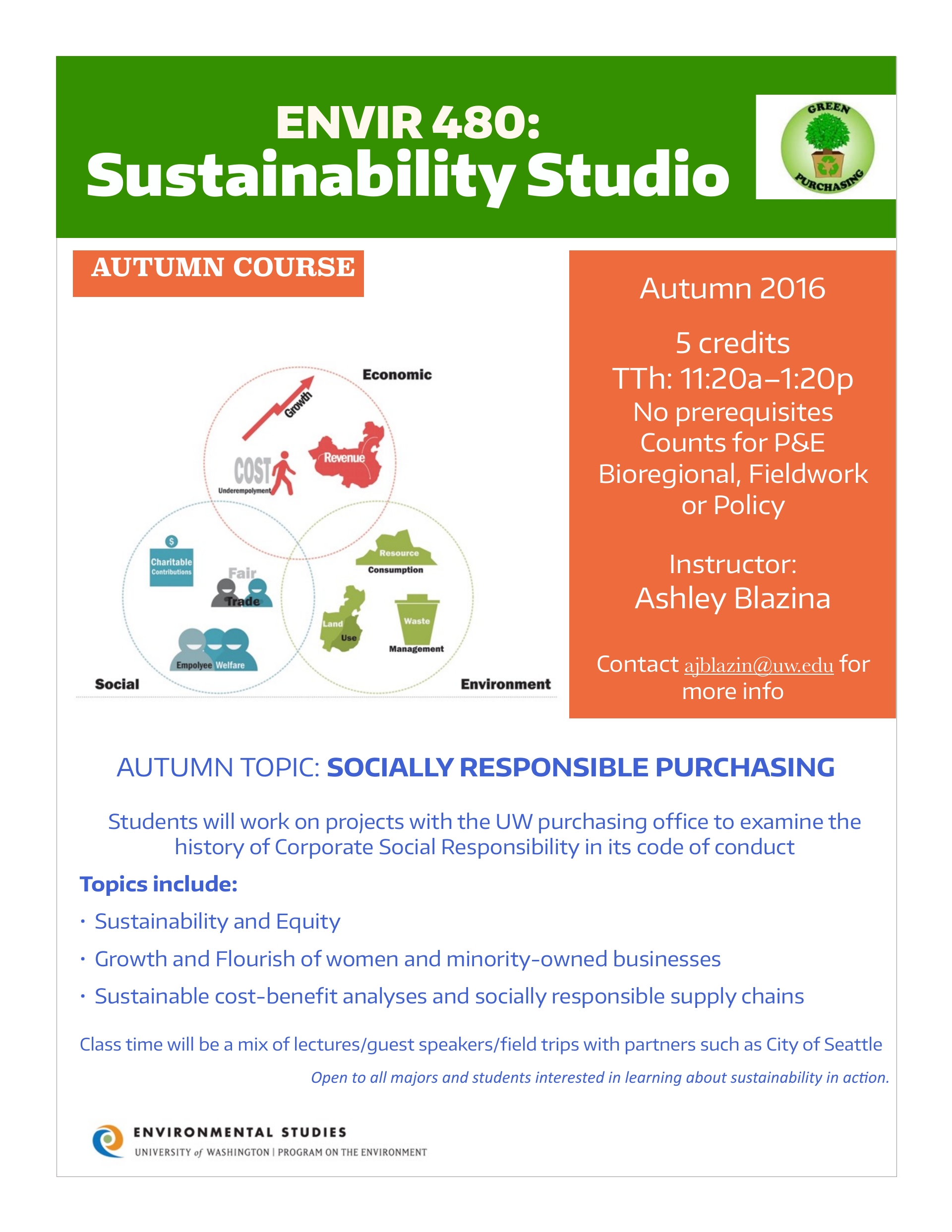 ENVIR 480: Sustainability Studio – Work with UW on socially responsible purchasing and conduct cost-benefit analyses on responsible supply chains.