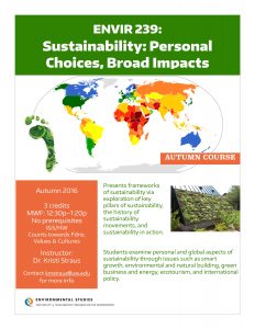 ENVIR 239: Sustainability: Personal Choices, Broad Impacts – Explore how food, energy and policy movements are moving our society towards a more sustainable future. Open to all majors.