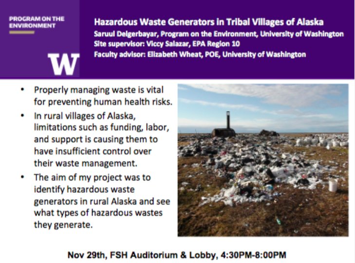 Sneak peek: Saruul Delgerbayar worked with the EPA on hazardous waste generators in rural villages of Alaska. Saruul assisted with EPA’s pilot program to backhaul hazardous waste from tribal communities lacking waste management systems and conducted interviews to identify the types of hazardous waste generated, to inform regulations that would benefit the communities’ overall health.