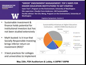 Sneak peek: Uyen Tran interned with UW Sustainability to examine sustainable finance and investment in higher education institutions. She conducted a competitive analysis along with two other students of the STARS (Sustainability Tracking, Assessment & Rating System) ranked colleges and looked into which higher ed institutions use SRI stocks and why that’s significant.