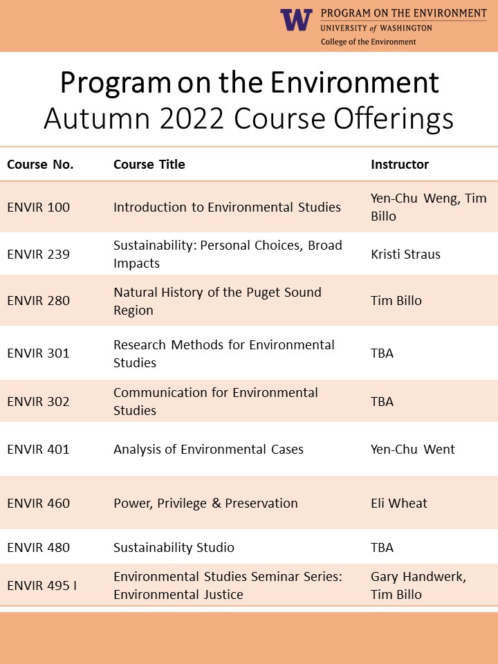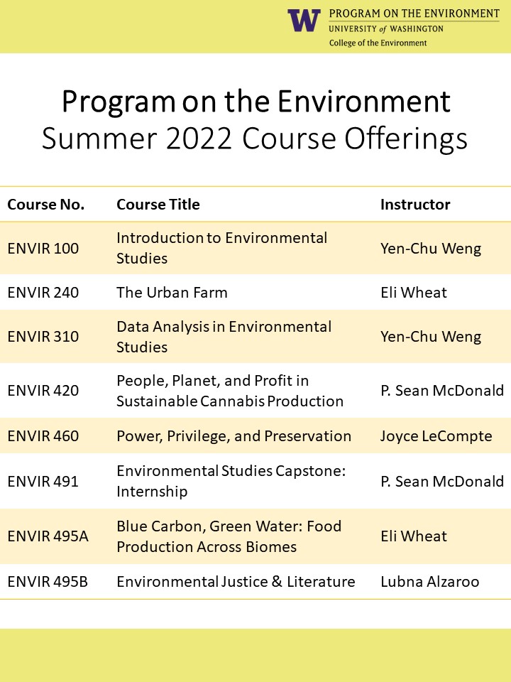 The Program on the Environment will host the Spring 2022 Capstone Symposium on Wednesday, May 25, online AND on Wednesday, June 1, in person. All are welcome to attend and support students as they present on the culmination of their hard work over three quarters.