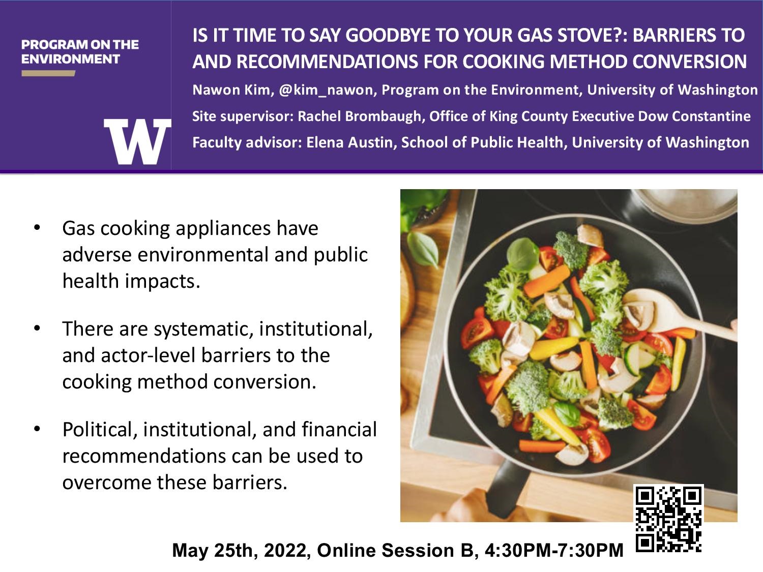 Nawon Kim (Room #11) – Is It Time to Say Goodbye to Your Gas Stove?: Barriers to and Recommendations for Cooking Method Conversion. Site Partner: Office of King County Executive Dow Constantine (Summary) (Poster PDF) (Video)