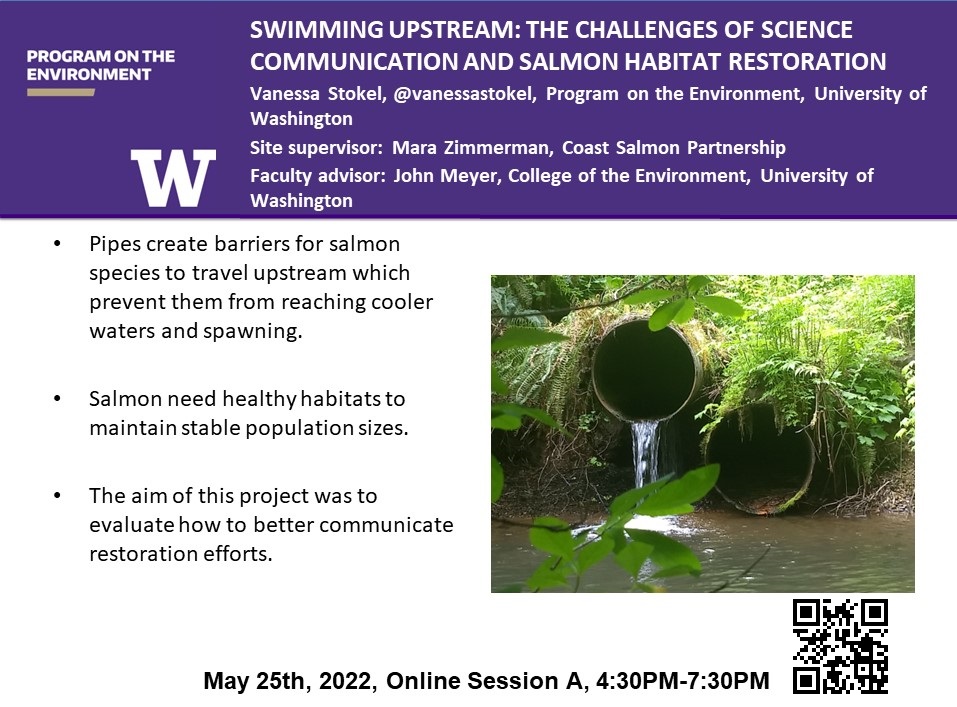 Vanessa Stokel (Room #16) – Swimming Upstream: The Challenges of Science Communication and Salmon Habitat Restoration. Site Partner: Coast Salmon Partnership (Summary) (Poster PDF) (Video)