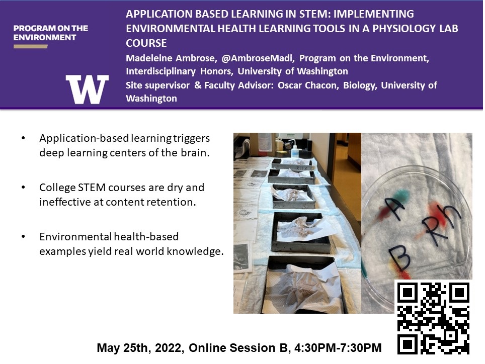 Madeleine Ambrose (Room #1) – Application Based Learning in Stem: Implementing Environmental Health Learning Tools in a Physiology Lab Course. Site Partner: (Summary) (Poster PDF) (Video)