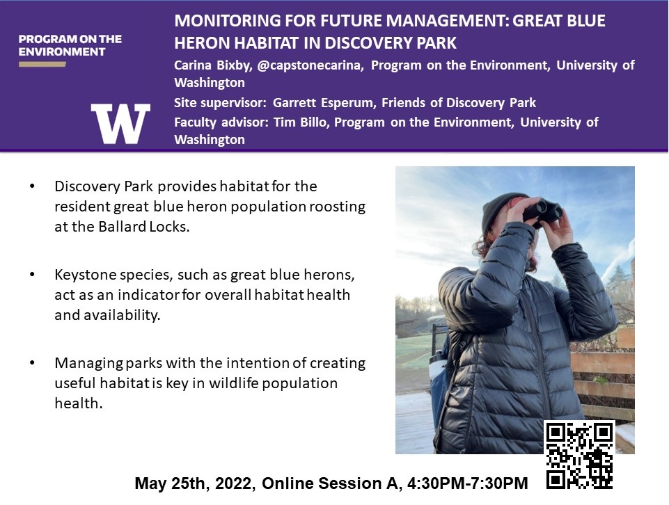Carina Bixby (Room #3) – Monitoring for Future Management: Great Blue Heron Habitat in Discovery Park. Site Partner: Friends of Discovery Park (Summary) (Poster PDF) (Video)