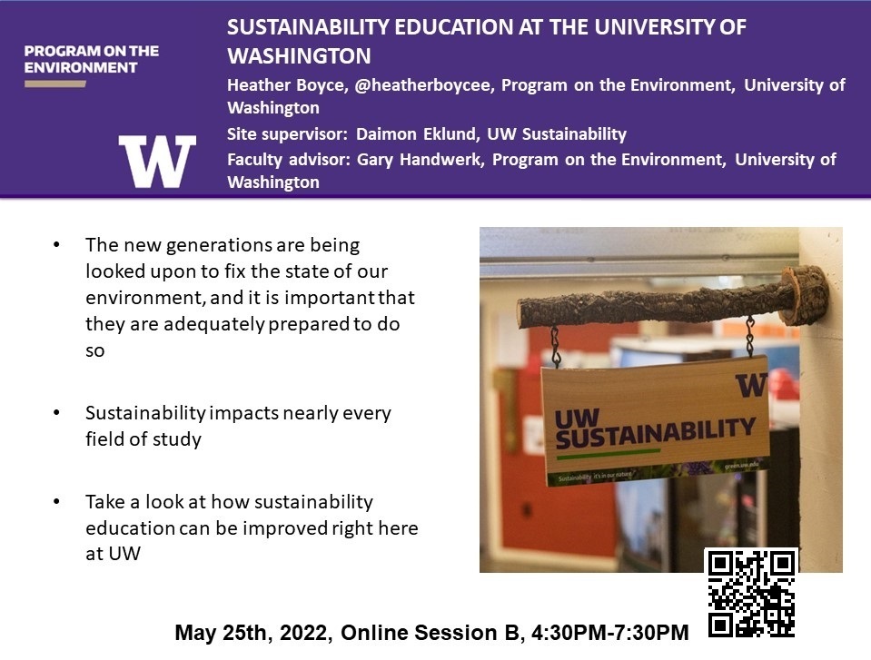 Heather Boyce (Room #2) – Sustainability Education at the University of Washington. Site Partner: UW Sustainability (Summary) (Poster PDF) (Video)
