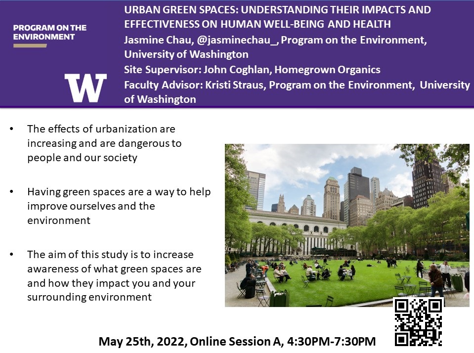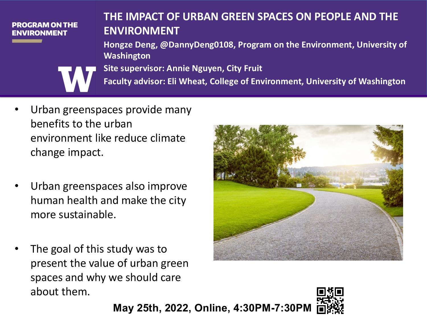 Hongze Deng (Room #6) – The Impact of Urban Green Spaces on People and the Environment. Site Partner: City Fruit (Summary) (Poster PDF) (Video)