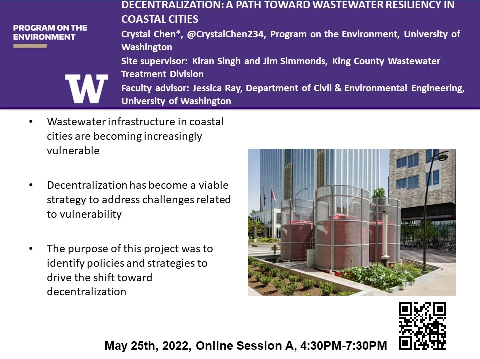 Crystal Chen (Room #7) – Decentralization: A Path Toward Wastewater Resiliency in Coastal Cities. Site Partner: King County Wastewater Treatment Division (Summary) (Poster PDF) (Video)