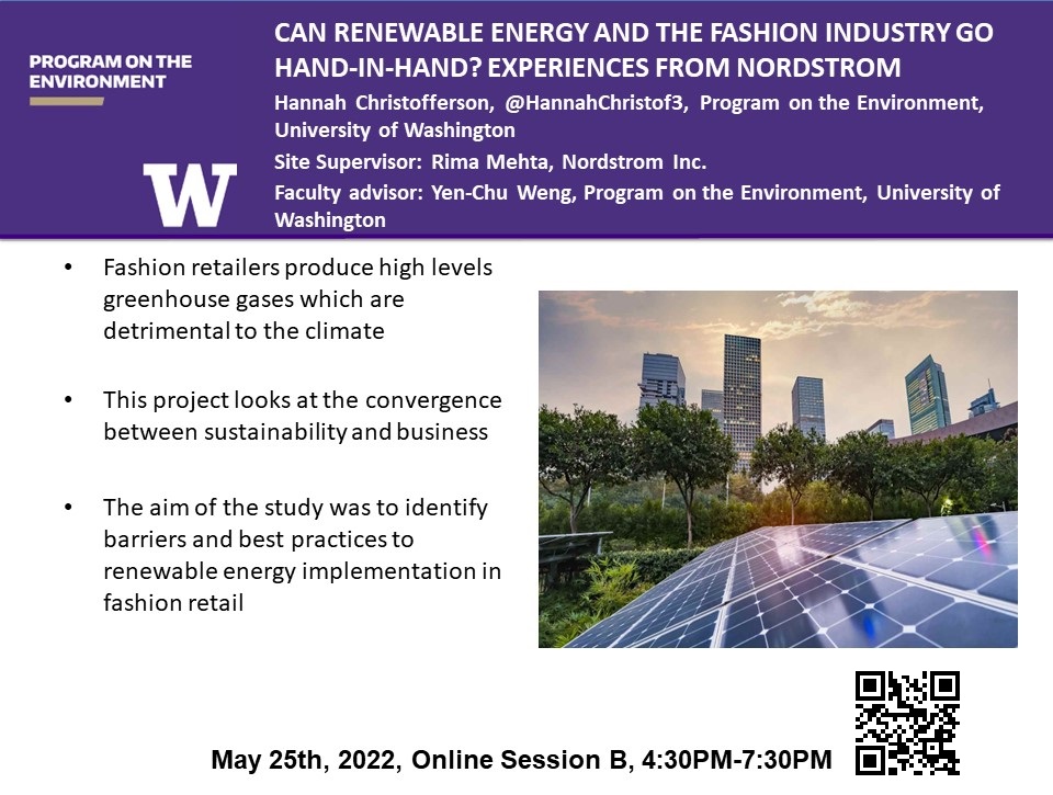 Hannah Christofferson (Room #3) – Can Renewable Energy and the Fashion Industry Go Hand-In-Hand? Experiences From Nordstrom. Site Partner: Nordstrom, Inc (Summary) (Poster PDF) (Video)