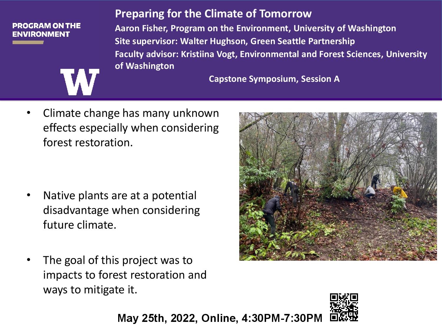 Aaron Fisher (Room #8) – Preparing for the Climate of Tomorrow. Site Partner: Green Seattle Partnership (Summary) (Poster PDF) (Video)