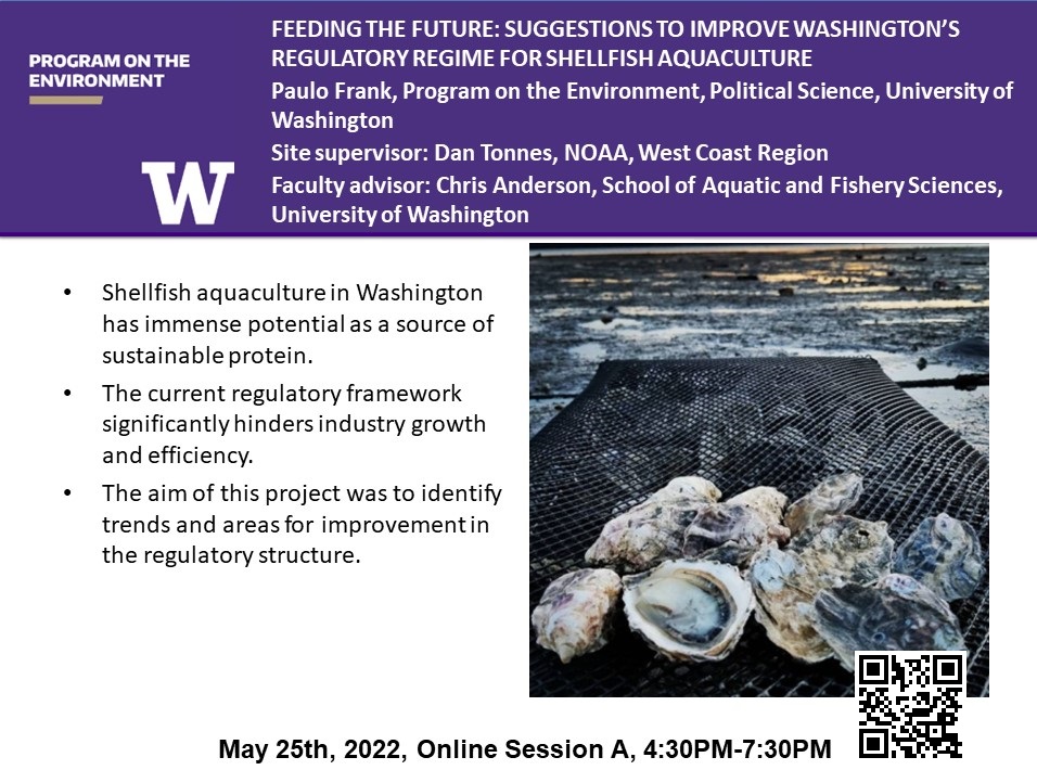 Paulo Frank (Room #9) – Feeding the Future: Suggestions to Improve Washington’s Regulatory Regime for Shellfish Aquaculture. Site Partner: NOAA, West Coast Region (Summary) (Poster PDF) (Video)