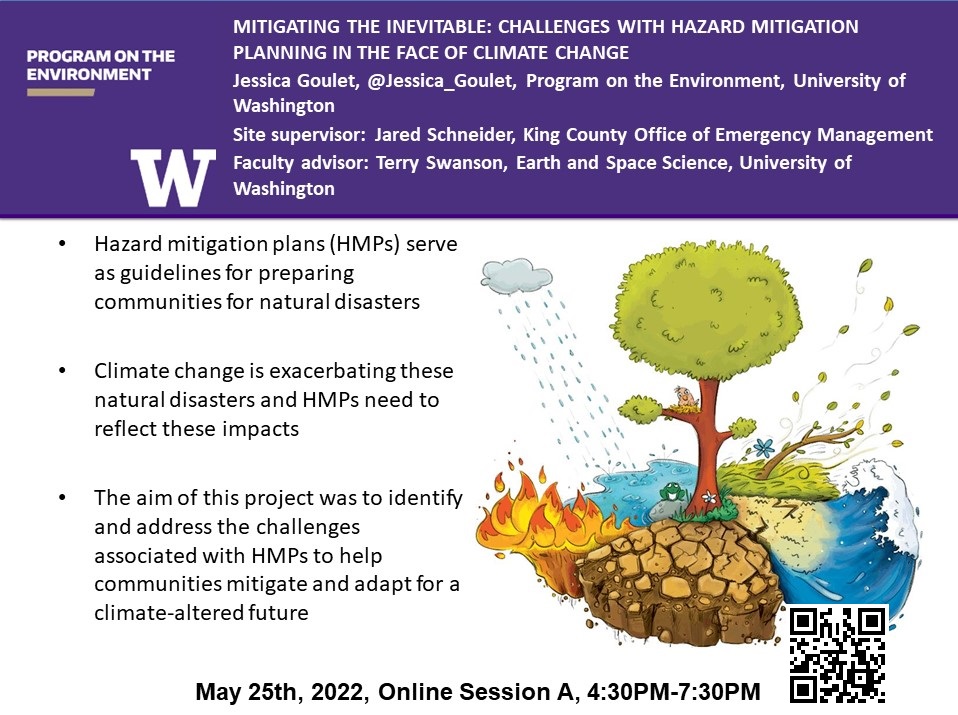 Jessica Goulet (Room #11) – Mitigating the Inevitable: Challenges With Hazard Mitigation Planning in the Face of Climate Change. Site Partner: King County Office of Emergency Management (Summary) (Poster PDF) (Video)