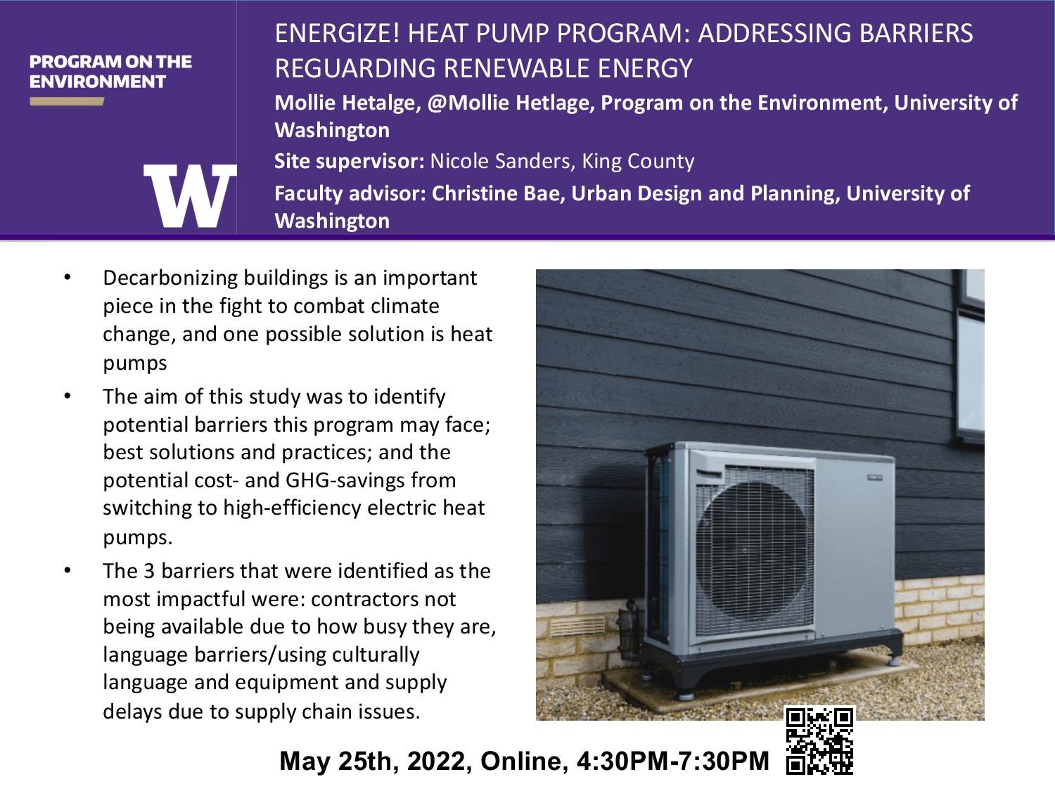 Mollie Hetlage (Room #8) – Energize! Heat Pump Program: Addressing Barriers Regarding Renewable Energy. Site Partner: King County Permitting Division (Summary) (Poster PDF) (Video)