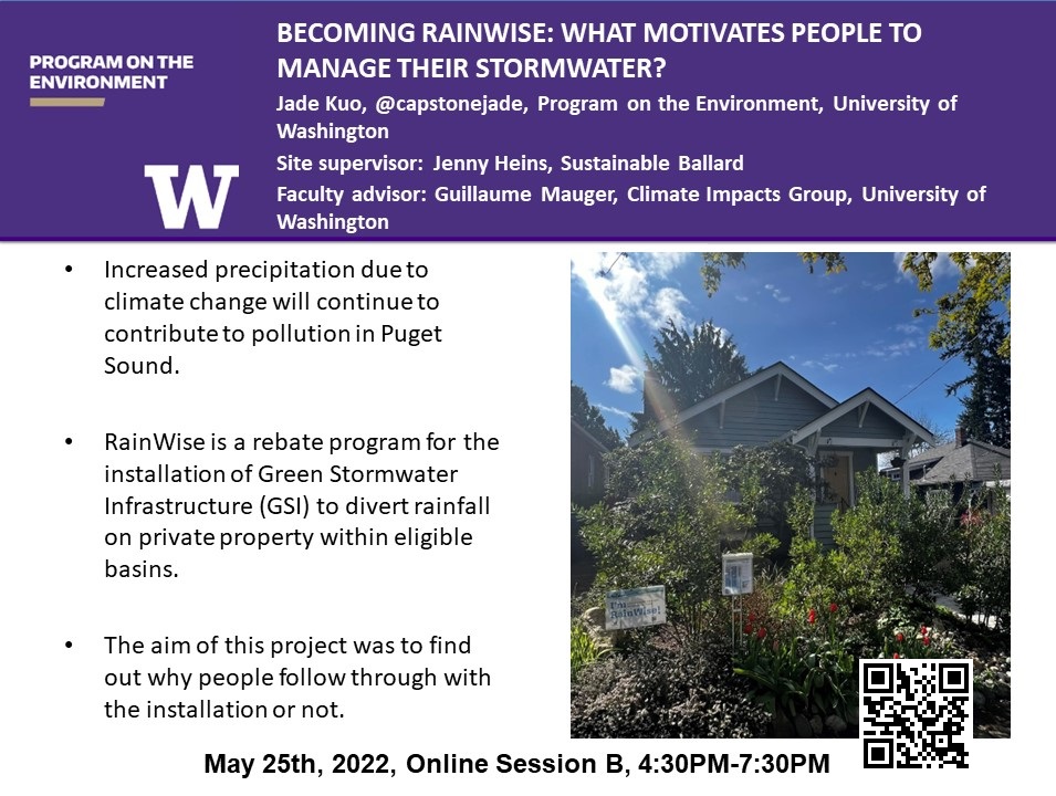 Jade Kuo (Room #12) – Becoming Rainwise: What Motivates People to Manage Their Stormwater? Site Partner: Sustainable Ballard (Summary) (Poster PDF) (Video)