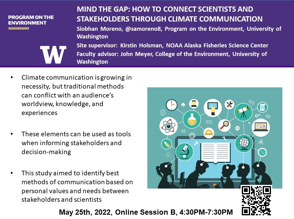 Siobhan Moreno (Room #13) – Mind the Gap: How to Connect Scientists and Stakeholders Through Climate Communication. Site Partner: NOAA Alaska Fisheries Science Center (Summary) (Poster PDF) (Video)