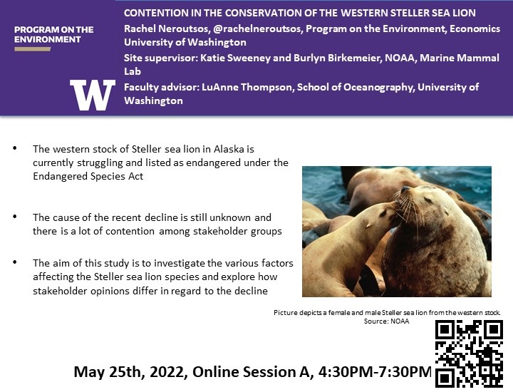 Rachel Neroutsos (Room #15) – Contention in the Conservation of the Western Steller Sea Lion. Site Partner: NOAA, Marine Mammal Lab (Summary) (Poster PDF) (Video)