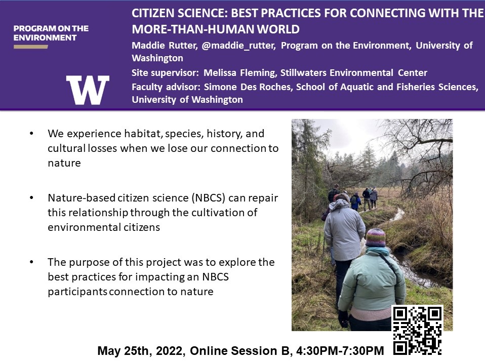 Maddie Rutter (Room #16) – Citizen Science: Best Practices for Connecting With the More-Than-Human World. Site Partner: Stillwaters Environmental Center (Summary) (Poster PDF) (Video)