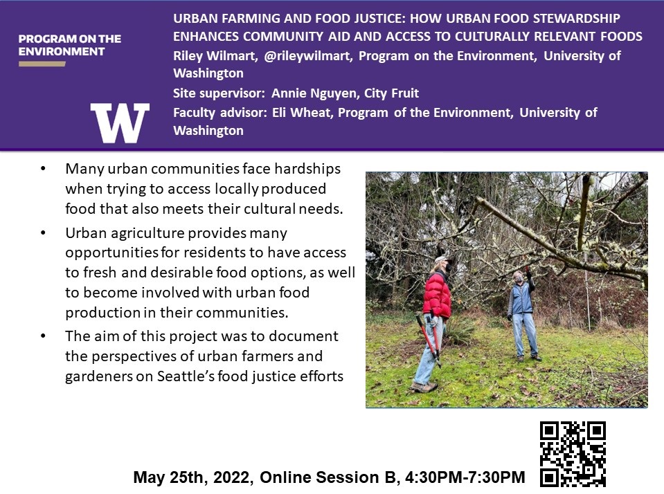 Riley Wilmart (Room #18) – Urban Farming and Food Justice: How Urban Food Stewardship Enhances Community Aid and Access to Culturally Relevant Foods. Site Partner: City Fruit (Summary) (Poster PDF) (Video)