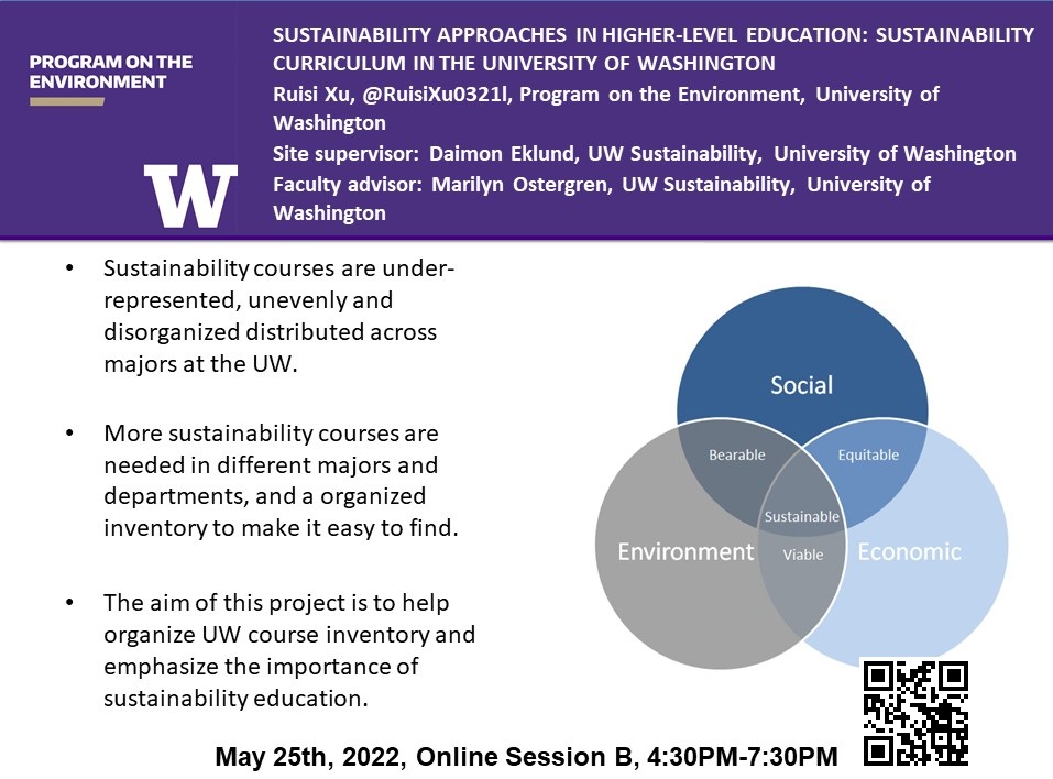 Ruisi Xu (Room #20) – Sustainability Approaches in Higher-Level Education: Sustainability Curriculum in the University of Washington. Site Partner: UW Sustainability (Summary) (Poster PDF) (Video)