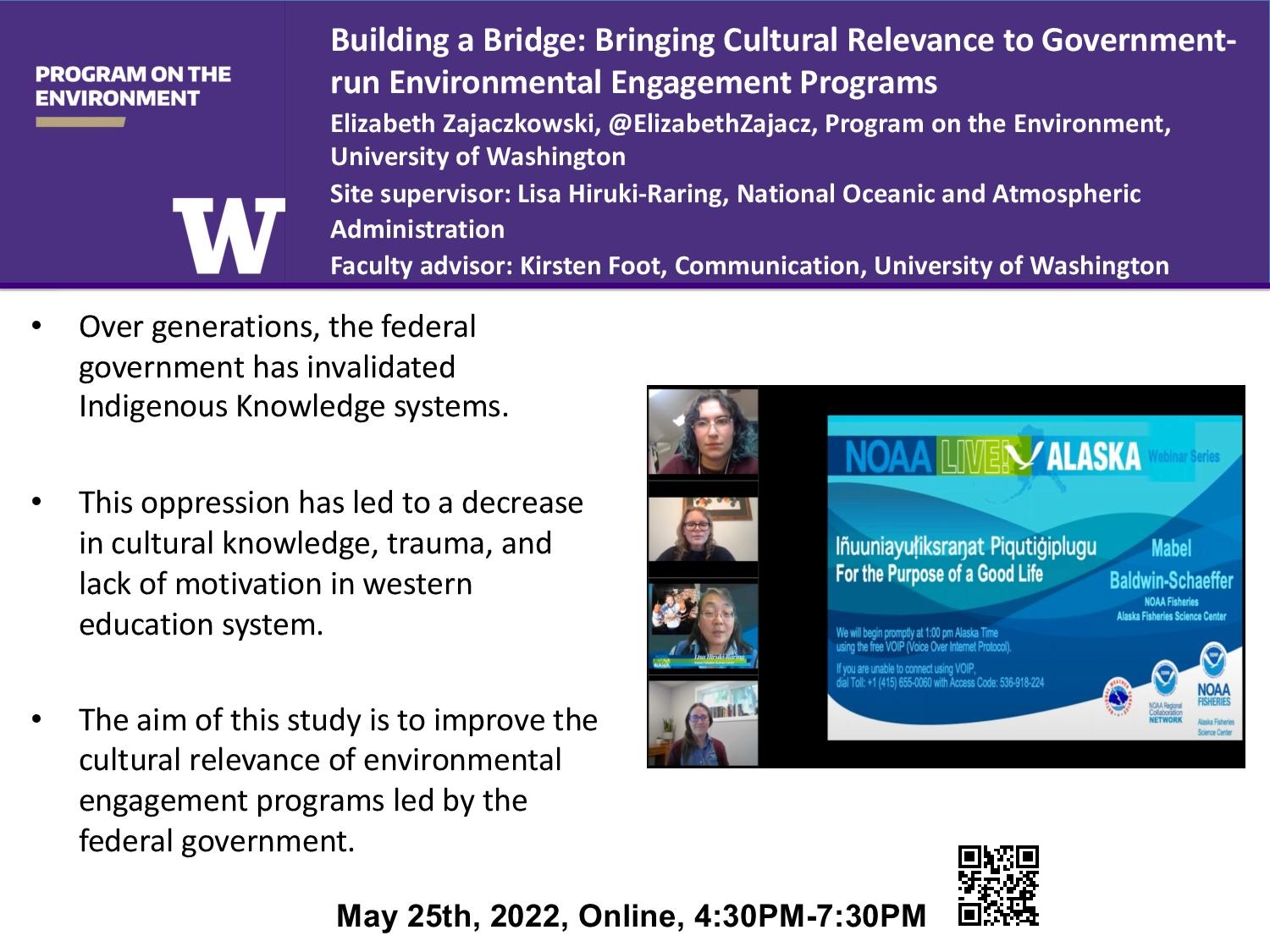 Elizabeth Zajaczkowski (Room #21) – Building a Bridge: Bringing Cultural Relevance to Government-Run Environmental Engagement Programs in Alaska. Site Partner: NOAA Alaska Fisheries Science Center (Summary) (Poster PDF) (Video)