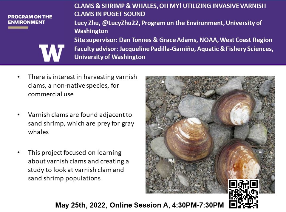 Lucy Zhu (Room #20) – Clams & Shrimp & Whales, Oh My! Utilizing Invasive Varnish Clams in Puget Sound. Site Partner: NOAA, West Coast Region (Summary) (Poster PDF) (Video)