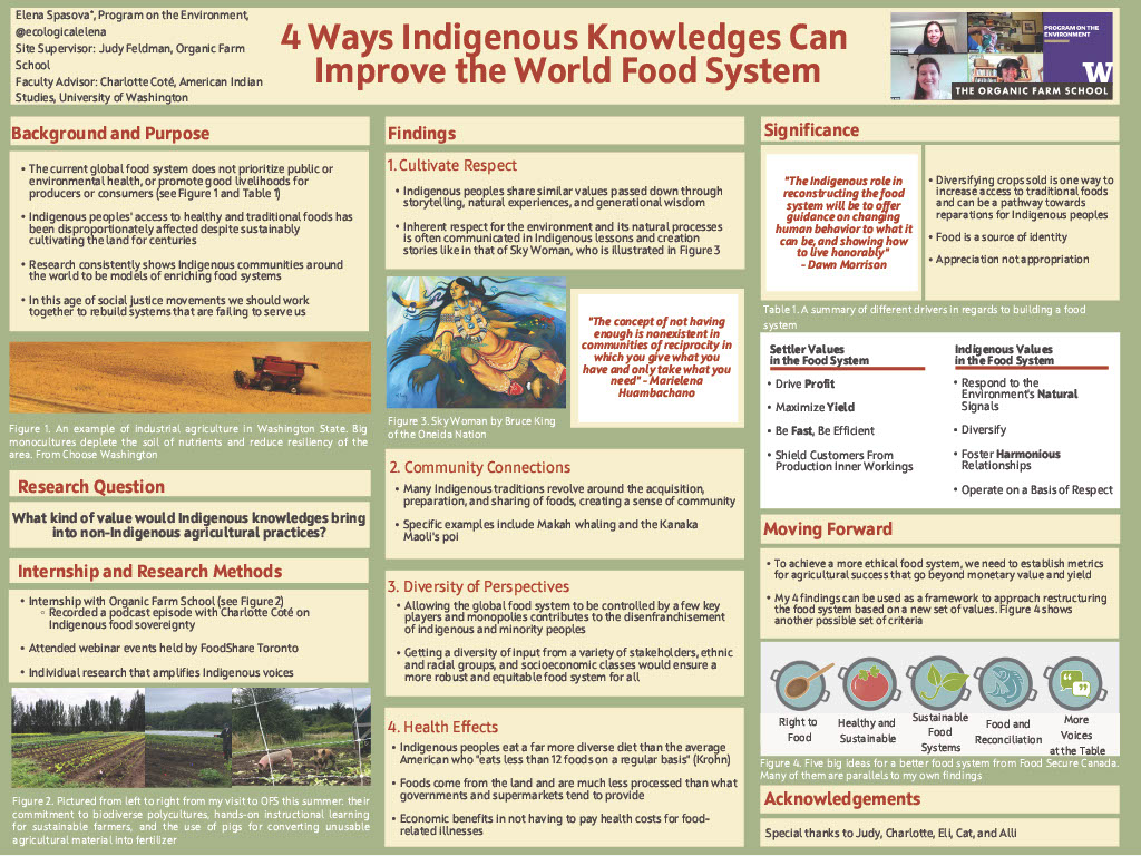 Environmental degradation, disenfranchisement of farmers, and the over industrialization of foods are common characterizations of our modern food system. Unfortunately, these practices are both unsustainable and unethical. The rate at which we are industrializing our food is leaving our people hungry, our land barren, and our economy too abstract for consumers or producers to participate in. On the other hand, Indigenous people have been living sustainably off of the land for centuries. We must view this as an opportunity to look and listen to Indigenous knowledge about how to keep our land and people living in harmony. The aim of my study was to explore how Indigenous knowledge can improve agricultural practices on a global scale. Results were collected from individual research and conversations with Indigenous food scholars. I also learned more about the agricultural system through my internship working on a podcast for the Organic Farm School. In my research I found that implementing Indigenous practices could foster a natural respect for the environment in people, as well as improve interpersonal relationships in the global food system. These results are important for building global systems using a diversity of perspectives, so that we can ensure more equitable systems for all. In addition to making the global food system more ethical and in line with consumer values, creating space for Indigenous knowledge within societal structures is a significant pathway towards reparations and healing for Indigenous people.