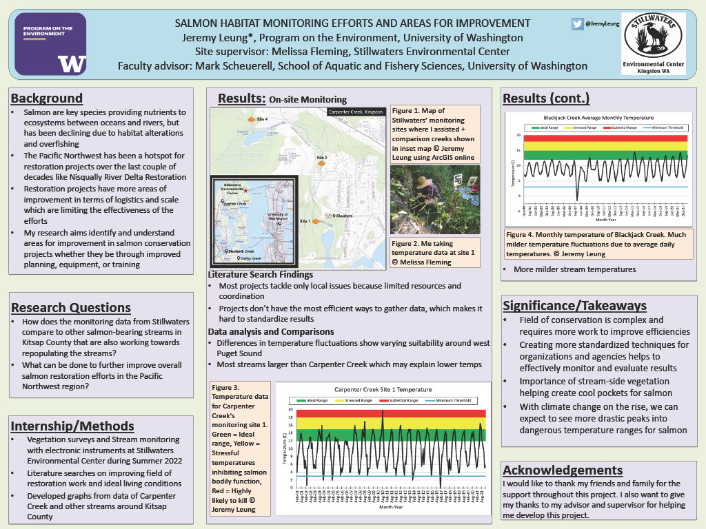 Salmon has been an ecologically and economically important subject in the Pacific Northwest region for time immemorial. From providing nutrients to a wide range of animals like orcas and bears to creating jobs in the multi-million dollar fishing industry, salmon continues to be a key species that many communities rely on for support. The problem arises when overfishing and human-made obstructions have limited salmon populations from recovering through the blockage of important habitat for growth. Within the recent two decades, multiple restoration and monitoring efforts have been implemented to restore salmon. The purpose of this study was to participate in one of these monitoring efforts to see the complexities of restoration work at Carpenter Creek led by Stillwaters Environmental Center in Kingston. To accomplish this task, I interned with Stillwaters to gather and analyze stream water data following the procedures with several volunteers, and corroborated the data with several literature articles on ideal salmon habitat and ways to optimize restoration. The resulting data was compiled into an infographic used by Stillwaters for the public. The findings from the work showed that there have been several times throughout the years of monitoring data in which certain spots of Carpenter Creek were nonoptimal for salmon development. Due to the way that data was taken only once a month by volunteers, methods of monitoring could be improved at a larger scale, as noted by several literature articles to improve the field of restoration work.