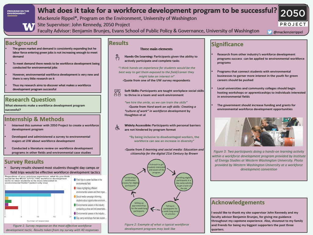 As scientists begin to understand more and more information surrounding Earth’s climate and environment, industries and careers in these fields are expanding just as fast. With new policies and green codes and research coming out every day, there becomes a need for new positions and more hands to help fill these positions and the labor force. This summer I attempted to answer the research question of what are the best elements that a workforce development program should have. The way I went about answering this question was administrating a survey to environmental majors at the University of Washington, attending a workforce development convention with my site supervisor, as well as an in-depth independent literature review and research. I discovered that the majority of students had rarely come across environmental workforce programs. I also concluded that programs designed for other industries are successful when they allow participants to work hands on, put emphasis on teaching soft skill, and are accommodating to participants who may have special circumstances, such as being a single parent without childcare or someone who cannot afford transportation. I got to apply this research when I had the privilege to work with 2050 Project on a workforce development program plan to garner more interest in environmental fields amongst Seattle youth. Programs such as these are important to help push younger workers towards environmental careers to continue the expansion and progress of environmental fields. We cannot have innovation or progress without people to push it forward.