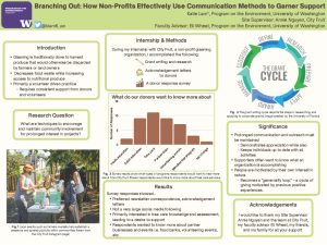 There are often many different moving parts in community based agricultural sustainability. Food banks that distribute fresh produce to neighborhoods need to be able to source their food, and much of the time they turn to gleaning organizations for help. Gleaning organizations are groups that partner with local businesses or farms to gather excess food that would otherwise become waste products, which is then either self-distributed or donated to food banks. These organizations require volunteers and donors for support in order to continue their essential work, and volunteers want to be able to find organizations whose ideals and methods they agree with. With all of these separate groups working together, it’s important to be able to communicate ideas concisely between each party. In this study, I worked with the non-profit urban orchard, City Fruit, to research effective communication techniques between a community based organization and its supporters. To accomplish this, I acted as a development coordinator to organize grant applications, donor information, and event sponsorship requests for City Fruit. During my internship I would make calls and write acknowledgement letters to supporters and record correspondence within our donor management software, Little Green Light. I also conducted a donor survey to analyze motivations and gather demographic information. I found that consistent communication, clear indication of goals for all parties, and mutual trust and understanding are some of the most important factors in maintaining healthy partnerships.