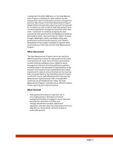 I worked with the EPA Region 10’s Sustainable Materials Management (SMM) team, a group which helps facilitate better waste and materials management practices with a goal of keeping materials in a closed-loop. The main focus of my internship and research was state government-led solid waste programs. I found solid waste disposal and recycling data for Region 10 states and evaluated the effectiveness of an online database for US states’ material use and disposal data developed by the EPA based on the feedback provided by state participants and my own experience using the questionnaire template. I also researched the role of state governments in managing state materials as mediators between federal and local governments.