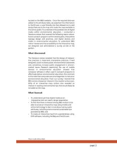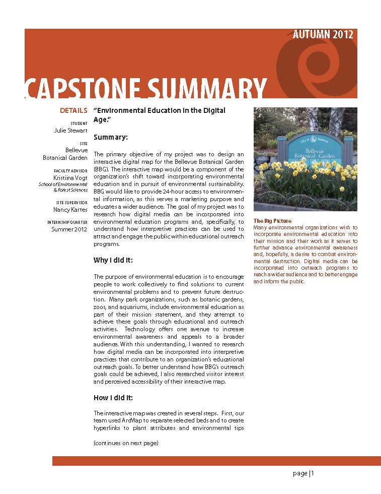 The primary objective of my project was to design an interactive digital map for the Bellevue Botanical Garden (BBG). The interactive map would be a component of the organization’s shift toward incorporating environmental education and in pursuit of environmental sustainability. BBG would like to provide 24-hour access to environmental information, as this serves a marketing purpose and educates a wider audience. The goal of my project was to research how digital media can be incorporated into environmental education programs and, specifically, to understand how interpretive practices can be used to attract and engage the public within educational outreach programs.