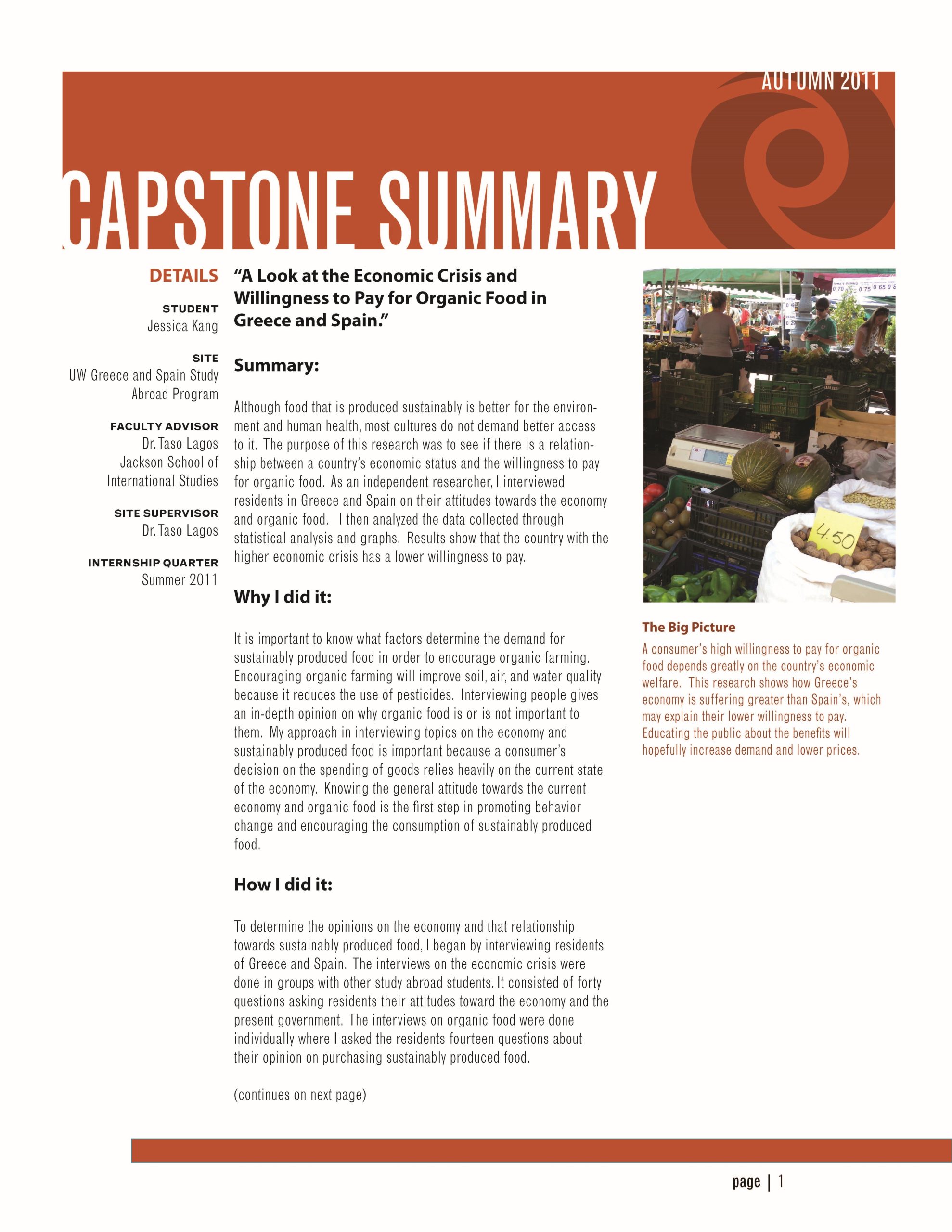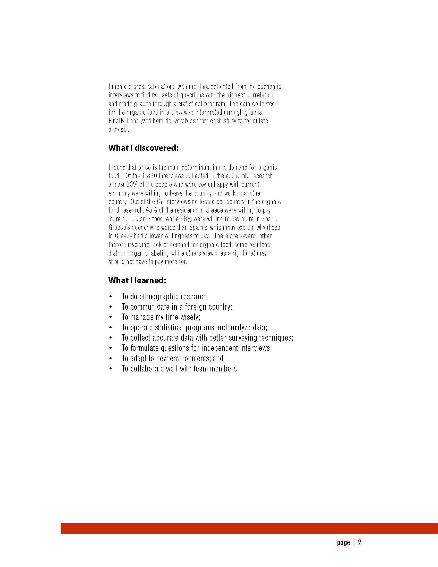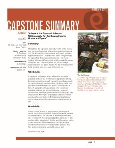 Although food that is produced sustainably is better for the environment and human health, most cultures do not demand better access to it. The purpose of this research was to see if there is a relationship between a country’s economic status and the willingness to pay for organic food. As an independent researcher, I interviewed residents in Greece and Spain on their attitudes towards the economy and organic food. I then analyzed the data collected through statistical analysis and graphs. Results show that the country with the higher economic crisis has a lower willingness to pay.