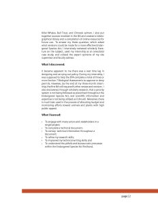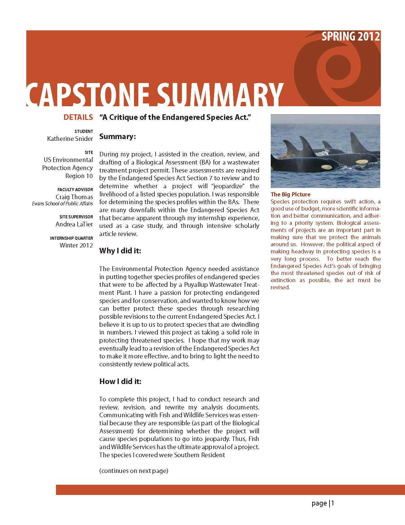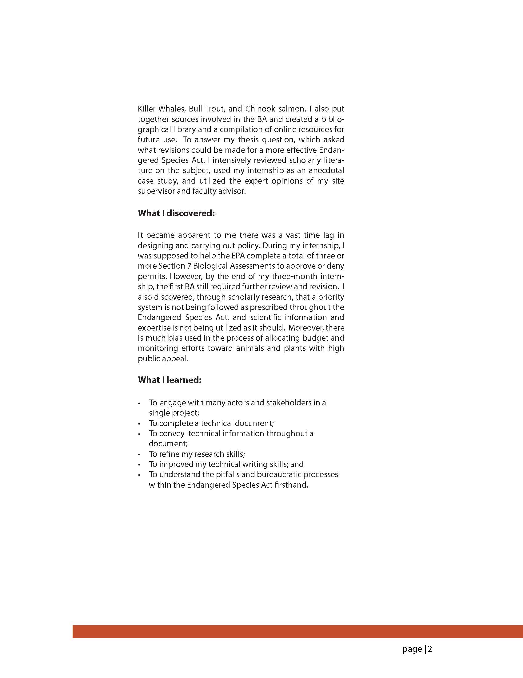During my project, I assisted in the creation, review, and drafting of a Biological Assessment (BA) for a wastewater treatment project permit. These assessments are required by the Endangered Species Act Section 7 to review and to determine whether a project will “jeopardize” the livelihood of a listed species population. I was responsible for determining the species profiles within the BAs. There are many downfalls within the Endangered Species Act that became apparent through my internship experience, used as a case study, and through intensive scholarly article review.