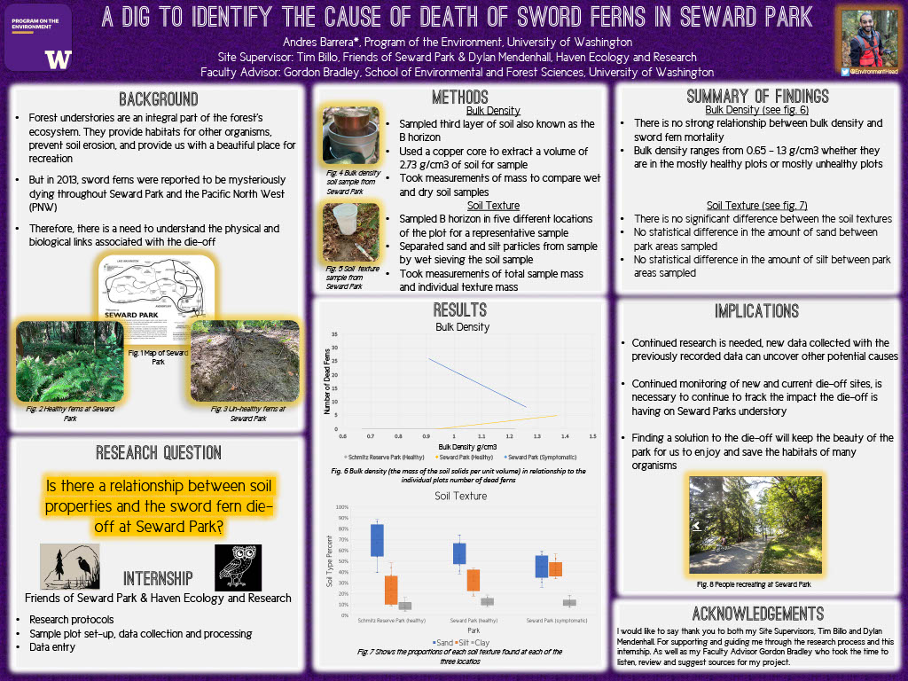 For the past decade, sword ferns across the Pacific North West have been sharply declining with no identified cause; these ferns are an essential part of a forest’s ecosystem and are supported by the soils around them. Healthy soils provide plants the ability to access nutrients, retain water, and allow for air exchange, and although sword ferns are resilient plants, without the proper soils, a sword fern’s growth can be disrupted. The purpose of this research is to help narrow down a potential cause to the sword fern die-off. To accomplish this, I interned with Friends of Seward Park and Haven Ecology & Research, which have been allocating time and resources into identifying a potential cause of this phenomenon. As part of my internship, I collected soil samples from Seward Park and Schmitz Preserve Park; from the plots we laid out, I collected bulk density samples, followed by a set of soil texture samples. Results show that bulk density is at levels that are associated with proper root growth and moisture content is not low enough to constitute drought as a potential cause. Furthermore, Seward park symptomatic ferns have a higher moisture content. However, they are still producing fewer fronds than those sword ferns found at Schmitz Preserve Park, that are experiencing a lower availability of moisture. These results are significant because they help narrow down the probable causes associated with the die-off; thus setting up the prospect for further research on other aspects of the sword fern’s environment.