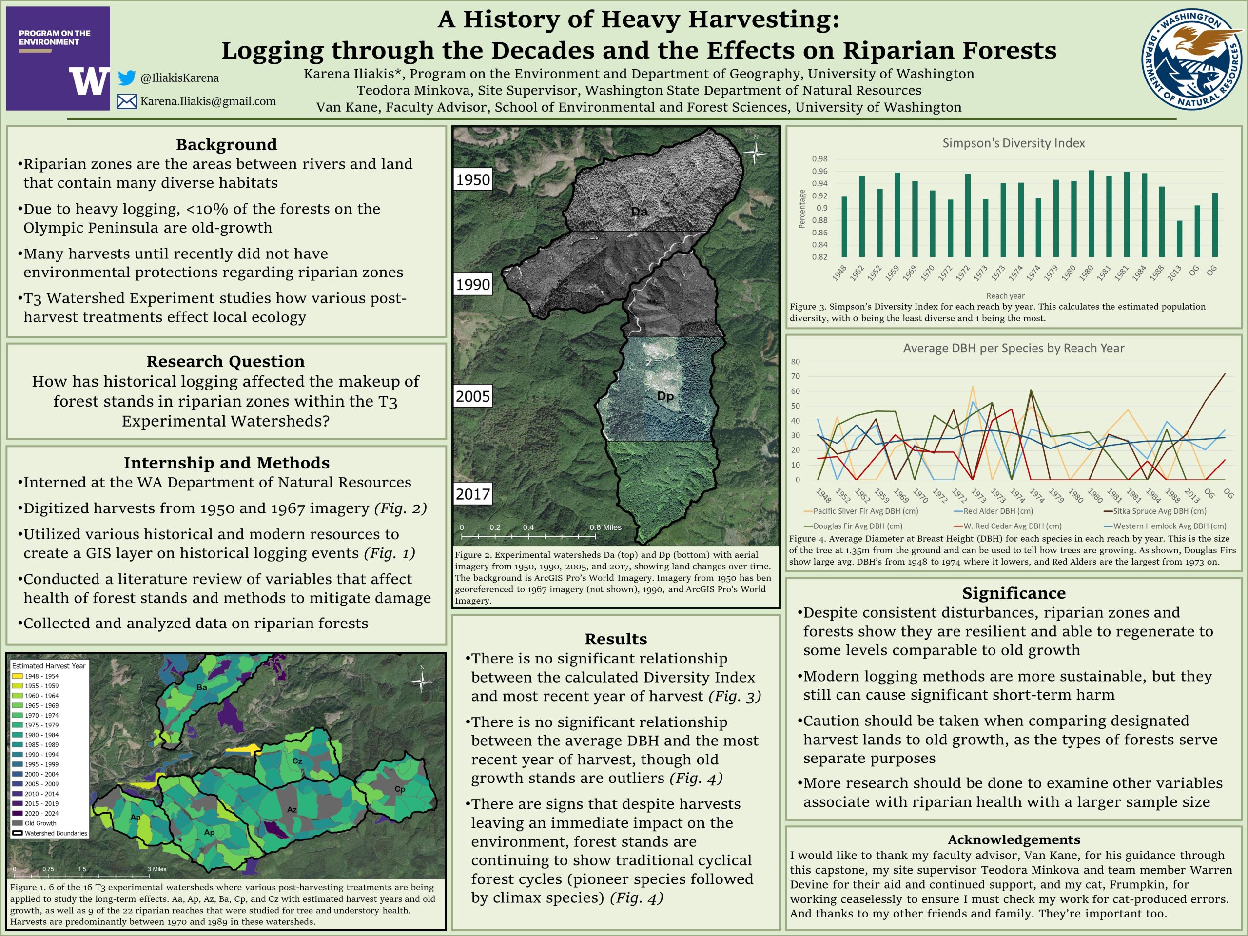 The Olympic Peninsula has a lush environment, and notably, riparian zones, the areas between rivers and dry land, are imperative for many healthy ecosystems. However, the peninsula also has a strong logging industry, which has historically disrupted riparian zones through intensive clear-cuts. It is important to understand how these forest stands have recovered after logging events to ensure a healthy ecosystem and better protect riparian zones that may still be recovering. The purpose of this research is to analyze how forests in riparian zones within the Olympic Experimental State Forest (OESF) have recovered after historical logging events. To accomplish this task, I created a map detailing historical logging in 16 watersheds within the OESF. Then, I gathered data on the health of forests in OESF’s riparian zones, such as the count of live and dead trees and biodiversity. This was followed by an analysis of these variables in relation to the most recent year of harvest. Many riparian forests that were harvested from 1940 onward show signs of recovery, such as natural forest successional patterns and high biodiversity of trees. Recently harvested areas had the lowest biodiversity, but they still show signs of expected forest succession. Areas that have been harvested should continue to be monitored for changes in regrowth, but these results show that best management practices meant to protect forests in Washington are working. Identifying areas that have recovered or need aid can also help in focusing restoration efforts where it is needed most.