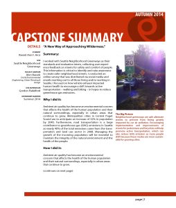 I worked with Seattle Neighborhood Greenways as their standards and evaluation intern, collecting user experience feedback on streets for safety and comfort of people. This information is critical to identify and raise awareness to create safer neighborhood streets. I conducted an online survey that was distributed via social media and emails reaching out to all those living and/or working in Seattle. I focused on how vehicle exhaust impacted human health to encourage a shift towards active transportation – walking and biking – in hopes to reduce greenhouse gas emissions.