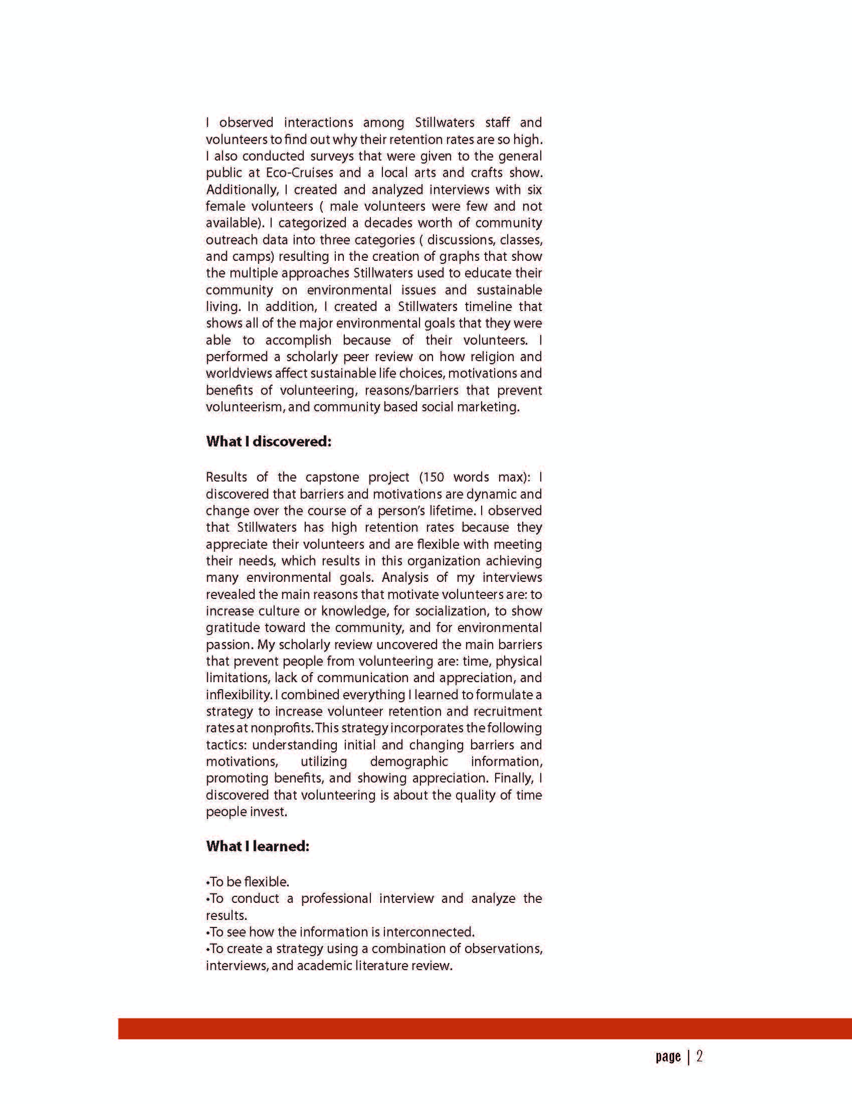 In order to tackle the environmental problems caused by climate change, it’s extremely important to understand the reasons why people are motivated towards or against volunteering and living a sustainable life. This information is essential for nonprofits to convey their message and recruit and retain more volunteers. I created a strategy for nonprofits based on: my observed interactions of Stillwaters staff and volunteers, interviews I conducted with volunteers, and a scholarly peer review of literature. The strategy I created increases volunteerism by combining the following tactics: identify barriers and motivations, utilize demographic information, promote benefits, and show appreciation of volunteers.