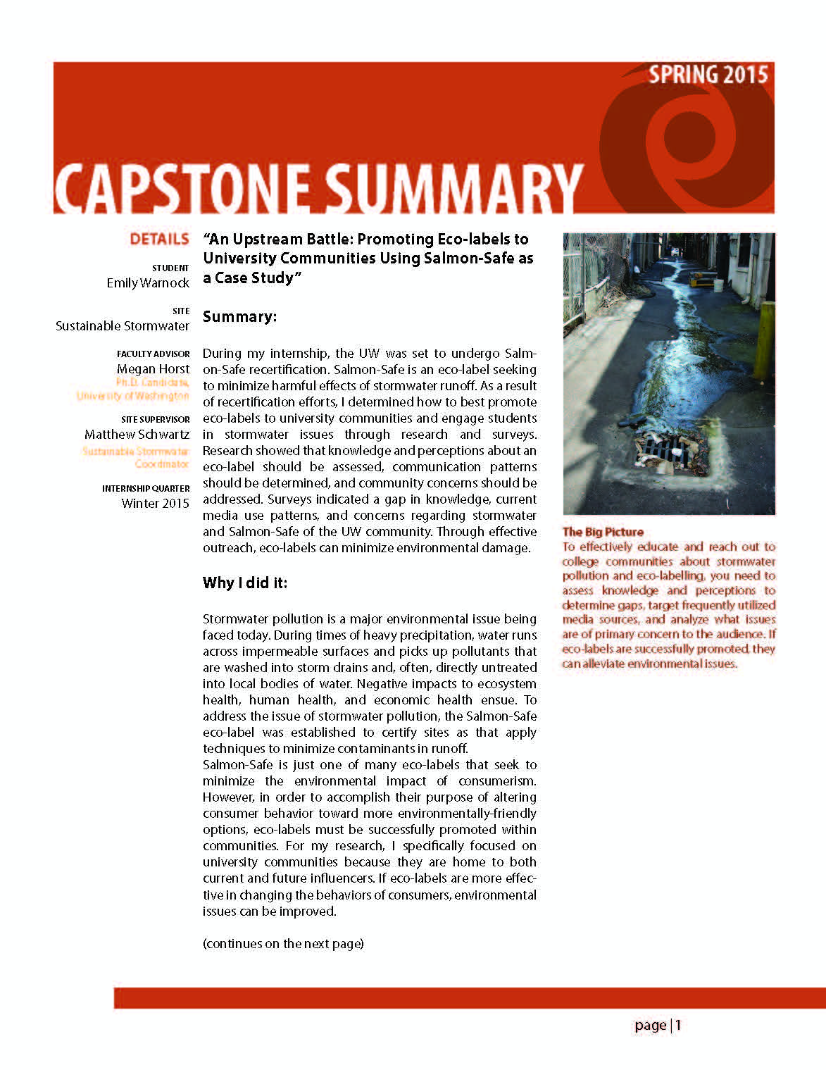 During my internship, the UW was set to undergo Salmon-Safe recertification. Salmon-Safe is an eco-label seeking to minimize harmful effects of stormwater runoff. As a result of recertification efforts, I determined how to best promote eco-labels to university communities and engage students in stormwater issues through research and surveys. Research showed that knowledge and perceptions about an eco-label should be assessed, communication patterns should be determined, and community concerns should be addressed. Surveys indicated a gap in knowledge, current media use patterns, and concerns regarding stormwater and Salmon-Safe of the UW community. Through effective outreach, eco-labels can minimize environmental damage.