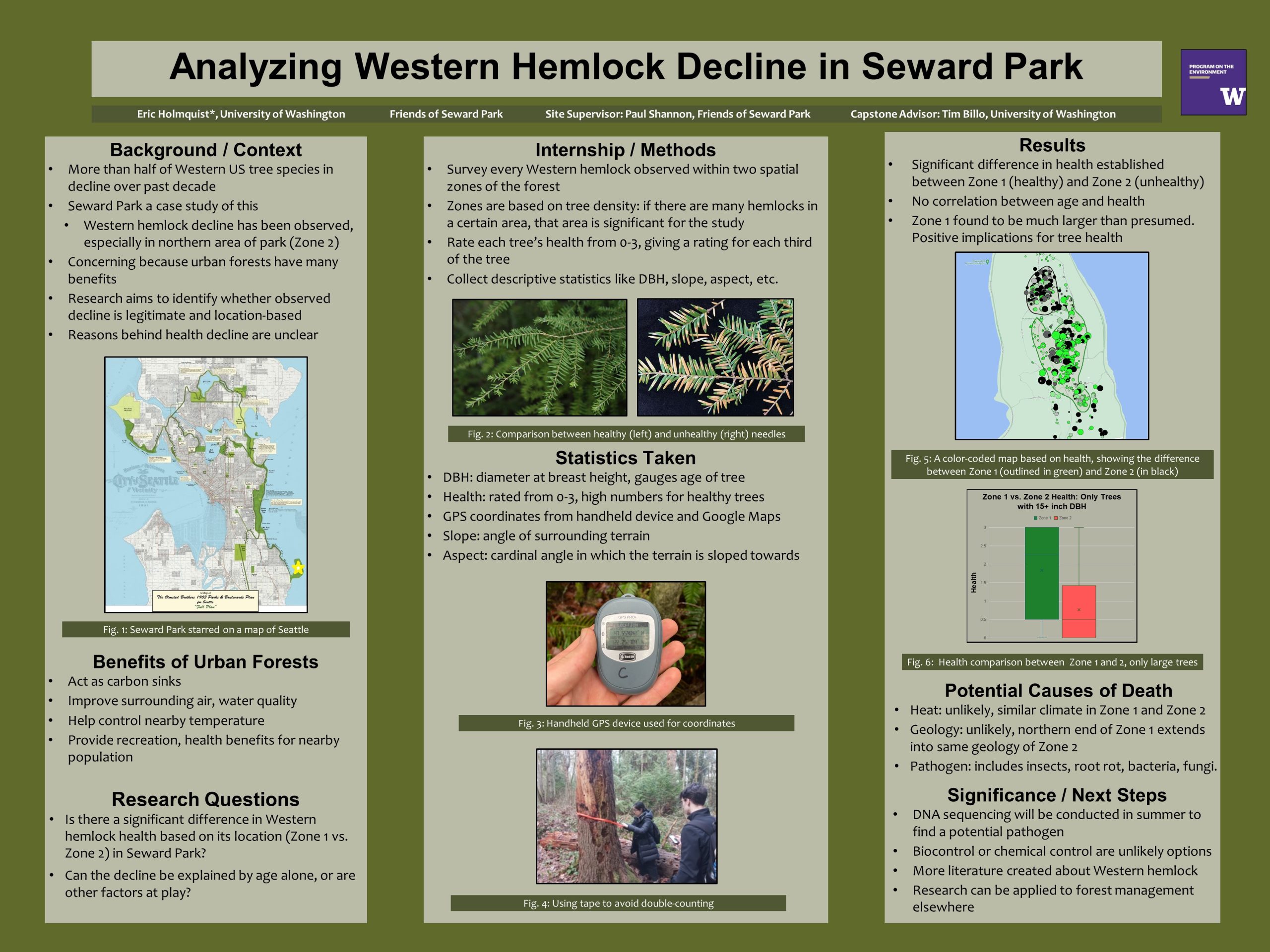 Urban forests offer a multitude of benefits, human-centered and otherwise. Seattle’s largest urban forest, Seward Park, has witnessed a significant decline in Western hemlocks over the past few years. This is part of a sobering, nationwide trend in tree deaths. We analyzed the spatial range of decline and determine whether the cause of the tree mortality was old age or another factor. Over a span of ten weeks, we surveyed over 700 trees in the forest, giving each of them a health rating, along with other descriptive statistics. Two survey sites were established at the beginning of the study, and we surveyed every tree we could find within those sites. Near the end of the survey, we used a density function to redefine the sites. The healthier region was significantly wider than we first predicted. Health ratings were taken, along with other descriptive statistics including DBH, slope, aspect and geographic coordinates. A large difference in health between the two areas was observed. This difference in health was not determined by age, as there was no correlation between diameter and health. This implies that a different factor is at play. Further research, including DNA sequencing, may inform us if there is a pathogen infecting the trees. Other possibilities, such as differing geology or climatic conditions, have been discarded. Western hemlocks are often overlooked in scholarly literature despite their abundance in Washington State, so further research will support management efforts elsewhere.
