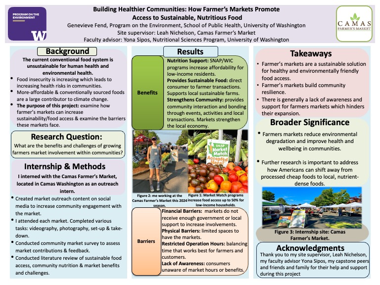 There is an increasing rate of food disparities, food related illnesses including obesity, heart disease, diabetes and lack of access to healthy and affordable food in communities. Supermarkets tend to be filled with lower quality produce and lots of processed foods that are created unsustainably. Conventional agriculture accounts for a significant contribution to environmental degradation and climate change. Farmers markets are an enriching way for us to sustainably access food within our communities. Farmers markets supply sustainable, nutrient dense and wholesome foods that you cannot access at supermarkets. These markets are critical in increasing sustainable food access, decreasing the rate of food related health implications and finally providing the opportunity to strengthen communities. I researched how farmers markets could further increase their involvement in communities and what are the common barriers that prevent them from doing so? I interned for the Camas Farmers Market by working as an outreach assistant to promote the market on social media in an attempt to attract more customers and community support. Besides working on the site, I completed my own research of literature about common benefits and challenges farmers markets experience. In my project I found that markets do not receive enough local and government support to expand despite how beneficial they are. As they improve well-being and health to the customers they serve. Even though they are of smaller significance now, I see that farmers markets will become a key strategy to increase community resilience in the future.