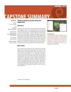 As environmental problems worsen, finding more efficient and effective ways to communicate with the general public has become more important than ever. During the course of the internship, I worked with two other interns and our site supervisor to create a prototype of an online digital map for the Bellevue Botanical Garden (BBG) using Geographic Information System (GIS) software. Our goal was to enrich both site and online visitors’ experiences by providing an interactive digital map. We also wished to attract more attention to the garden, to raise environmental awareness, and to foster environmental stewardship.