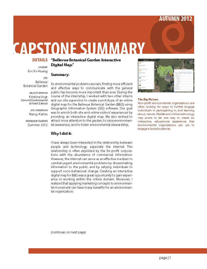 As environmental problems worsen, finding more efficient and effective ways to communicate with the general public has become more important than ever. During the course of the internship, I worked with two other interns and our site supervisor to create a prototype of an online digital map for the Bellevue Botanical Garden (BBG) using Geographic Information System (GIS) software. Our goal was to enrich both site and online visitors’ experiences by providing an interactive digital map. We also wished to attract more attention to the garden, to raise environmental awareness, and to foster environmental stewardship.