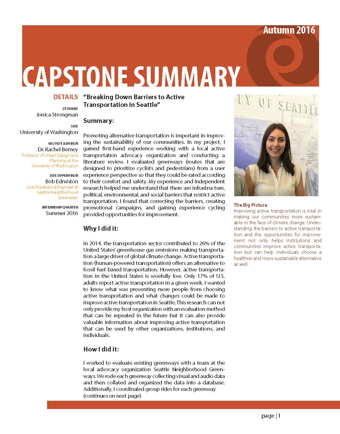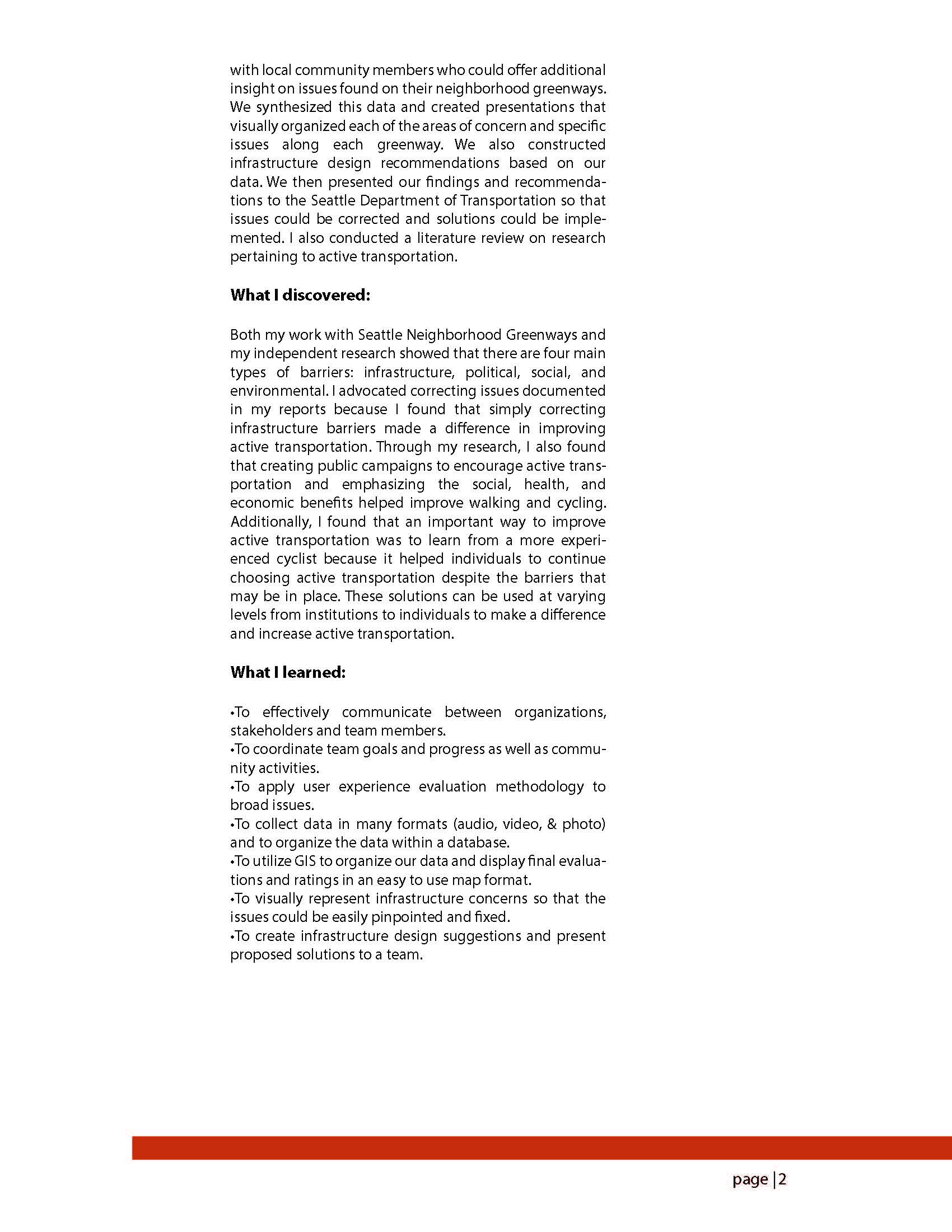 Promoting alternative transportation is important in improving the sustainability of our communities. In my project, I gained first-hand experience working with a local active transportation advocacy organization and conducting a literature review. I evaluated greenways (routes that are designed to prioritize cyclists and pedestrians) from a user experience perspective so that they could be rated according to their comfort and safety. My experience and independent research helped me understand that there are infrastructure, political, environmental, and social barriers that restrict active transportation. I found that correcting the barriers, creating promotional campaigns, and gaining experience cycling provided opportunities for improvement.