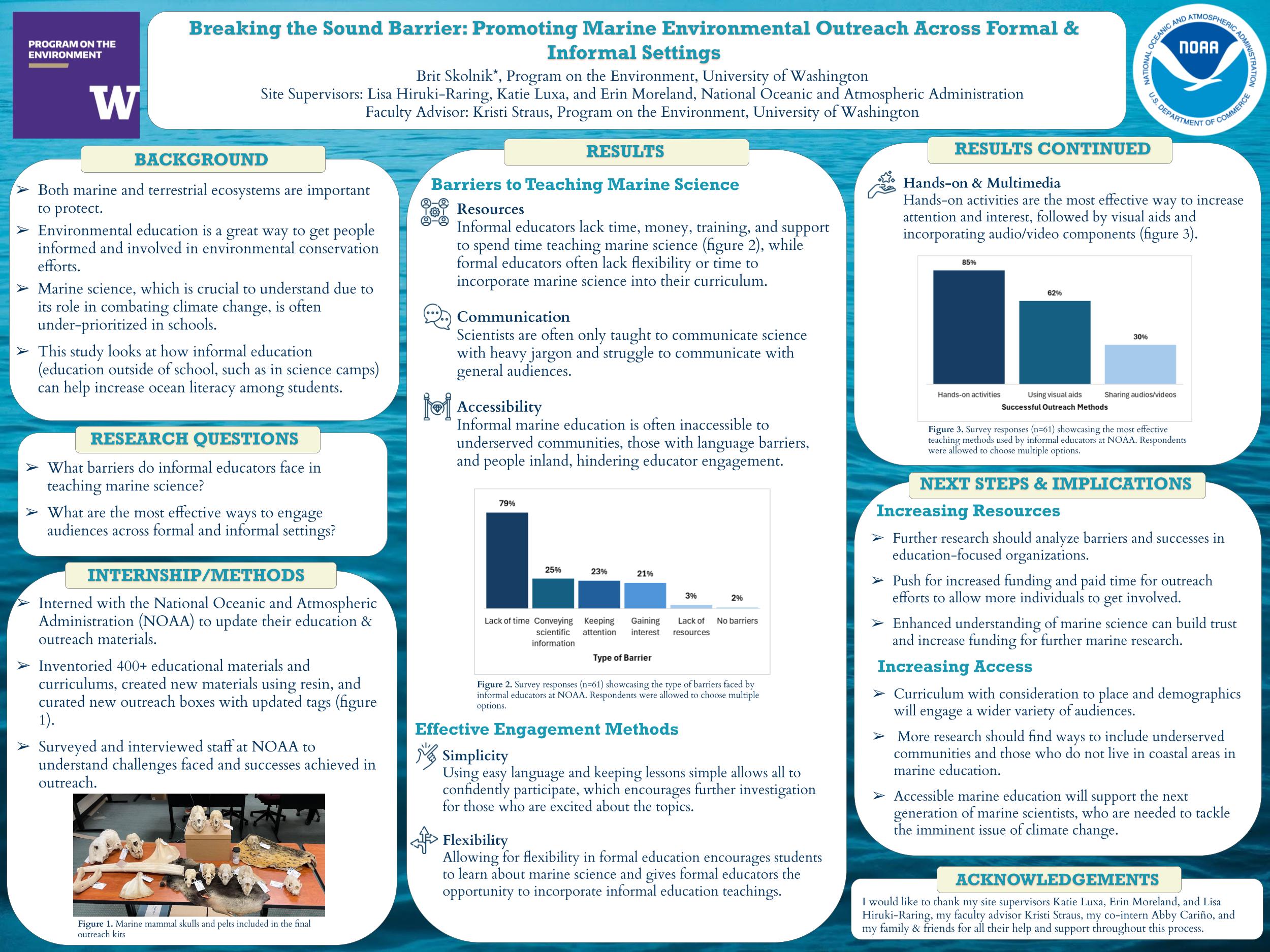Environmental education is crucial for promoting environmental literacy, critical thinking, and environmentally positive behaviors across general audiences. It is important to understand both land and marine ecosystems. However, schools tend to prioritize terrestrial environmental science while neglecting marine science, even though the importance of marine education has long been recognized due to the fact that protecting marine ecosystems is key to reversing issues such as climate change and protecting fish populations that provide jobs and sustenance to many. Informal education, which occurs outside the classroom in settings such as science centers or aquariums, can improve students’ ocean literacy and promote behaviors that benefit marine life. This study aims to understand the barriers faced and successes achieved by informal educators in teaching marine science to general audiences. During my internship with the National Oceanic and Atmospheric Administration (NOAA) as an Education and Outreach intern, I surveyed NOAA staff about their outreach experiences and interviewed staff with heavy outreach and education responsibilities. Through these methods, I discovered that education and outreach endeavors often lack time and resources, hands-on activities are the most effective at getting students engaged, simplicity and easy language is key for maintaining attention, and the importance of making marine education equitable. Promoting accessible non-formal marine education has the potential to increase overall awareness, foster trust in marine science, and help nurture the next generation of marine and environmental scientists to address climate change and other environmental challenges.